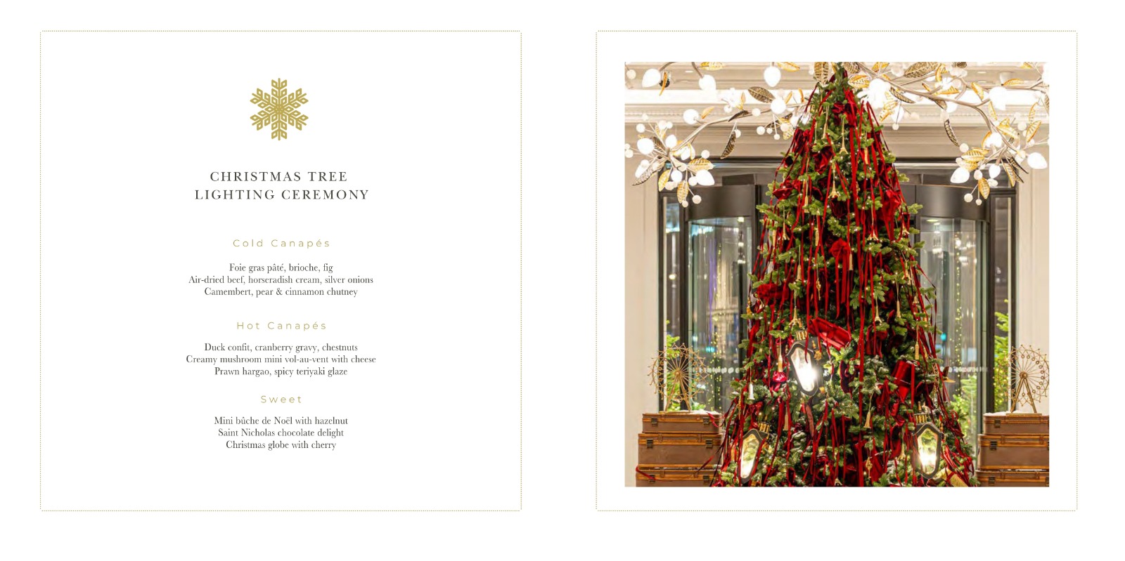 O selecție rafinată de gustări de sezon precum foie gras, confit de rață, colțunași Har Gow și deserturi consacrate precum bûche de Noël