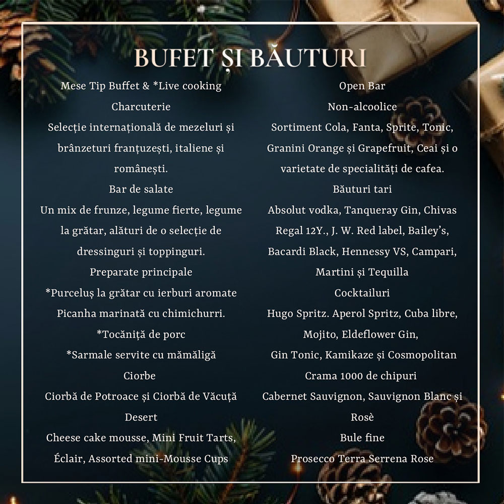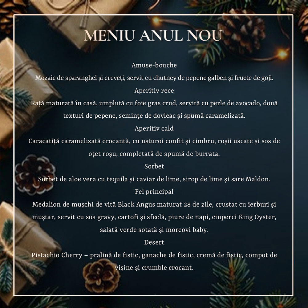 Ediția de anul acesta oferă o experiență unică, cu preparate culinare special selectate într-un meniu set cu 7 feluri de mâncare, bufete cu preparate speciale, băuturi premium focuri de artificii și muzică live menite să te introducă într-o atmosferă autentică de de revelion.